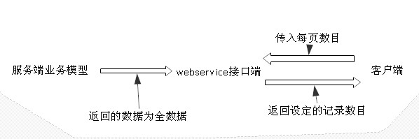 從上圖中,看到不管數(shù)據(jù)表中有多少數(shù)據(jù),每次返回到客戶端的數(shù)據(jù)都是一頁的數(shù)據(jù),這種方法沒有采用存儲過程方式,而是在webservice端進行處理的。