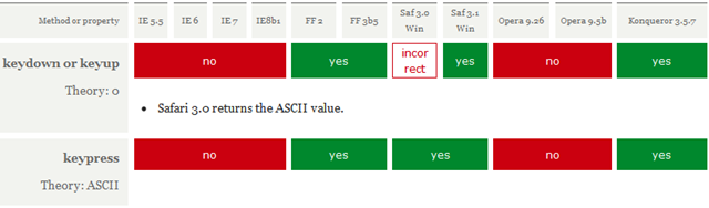 因此,在onkeydown/up的情況下,你能夠從keyCode里面得到鍵值。在onkeypress情況下,想要得到字符值就要使用:evt.charCode || evt.keyCode.