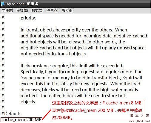 6)找到# cache_mem 8 MB這句刪掉前面的#號(hào)將默認(rèn)的8修改到需要的大小,這里的數(shù)值應(yīng)視具體的機(jī)器可用內(nèi)存而定,應(yīng)在內(nèi)存允許的情況下盡量地設(shè)置的大一些以提高代理服務(wù)器性能,但不能讓代理服務(wù)器的緩存大小影響本機(jī)器的性能。如下圖操作即可。