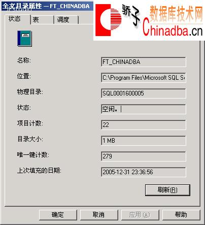 12:可以通過雙擊全文目錄下的全文索引,查看該全文目錄的屬性,如 圖12 所示,狀態(tài)為“空閑”,而項目計數(shù)大于0,則表示完全填充已經(jīng)完成了。