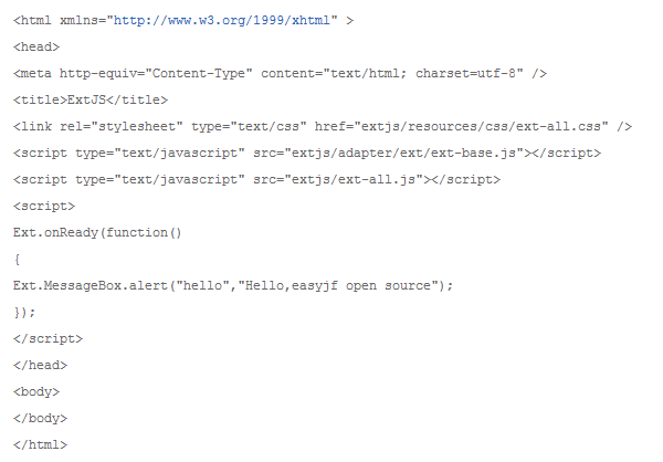 怎么樣,看了以上內(nèi)容,是不是迫不及待的想動手試試了?別急,下面我們寫一個(gè)最簡單的ExtJS應(yīng)用,在hello.html文件中輸入下面的代碼: