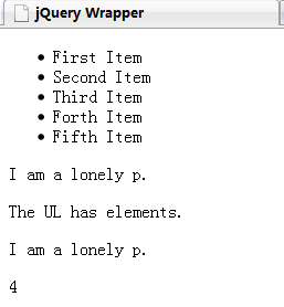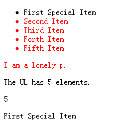 第一行演示了html和size的用法。按上面的介紹,兩個span中的內(nèi)容都應(yīng)該會變成5. 第二行演示了not和add的一個用法。最終后四個li和第一個p會變成紅色。第三行演示了get的用法,一旦調(diào)用get之后,返回值就不是包裝元素而是HTML元素,因此可以使用HTML DOM提供的方法設(shè)置innerHTML。最后一行還是演示html()的用法,要注意html()返回的是第一個元素的內(nèi)部內(nèi)容,但是html(text)會把所有元素的內(nèi)容都設(shè)置成text。 最終的結(jié)果如下: