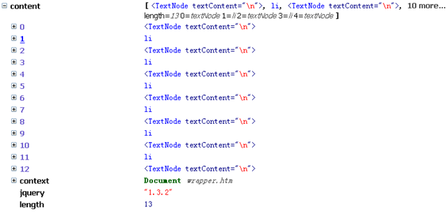 children()返回的包裝集的數(shù)量是6,說明最后一個嵌套的<ul>僅算作一個元素。但是contents()返回的包裝集的數(shù)量多達13。利用調(diào)試器查看一下它的內(nèi)容: