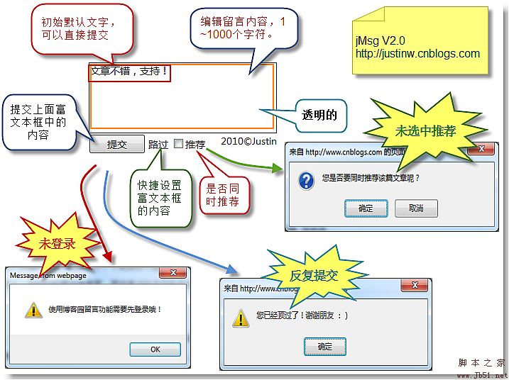 最后,新版快捷留言功能對(duì)上一版的使用者完全支持透明升級(jí),也就是說(shuō)原來(lái)使用上一版的用戶,現(xiàn)在自己的博客里看到的應(yīng)該已經(jīng)是最新版本的界面和功能了!這里再重新說(shuō)一遍jMsg的使用方法,跟以前完全一樣: