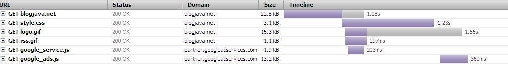 阻塞下載圖:下圖是訪問blogjava首頁的時間瀑布圖,可以看出來開始的2個image都是并行下載的,而后面的2個JS都是阻塞下載的(1個1個下載)。