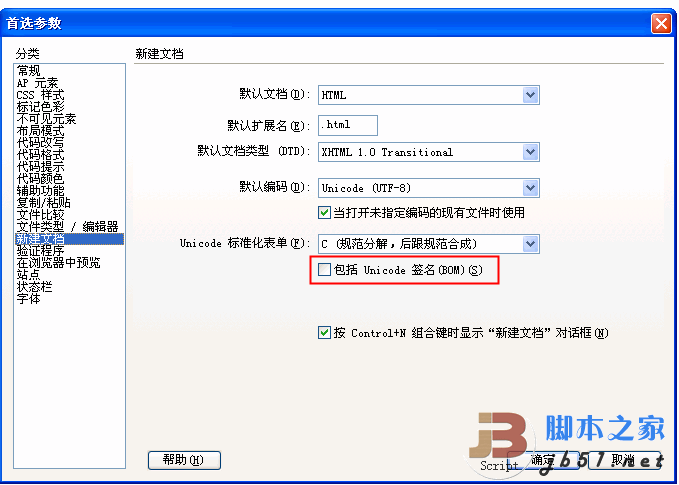 另外,DreamWeaver CS3也有類似的選項(xiàng),在“首選項(xiàng)”中,如果選擇 Unicode (UTF-8) 作為默認(rèn)編碼,則可以選擇“包括 Unicode 簽名 (BOM)”選項(xiàng),以在文檔中包括字節(jié)順序標(biāo)記 (BOM)。否則,不帶BOM: