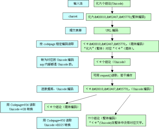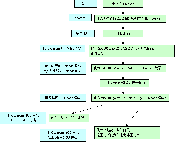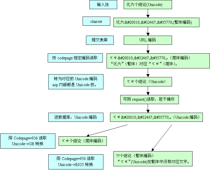 服務(wù)器端:IIS解開表單編碼--按codepage指定編碼讀取--轉(zhuǎn)換到對應(yīng)的Unicode--可以用request("")讀取了--進(jìn)行一些處理--以Unicode編碼保存到數(shù)據(jù)庫