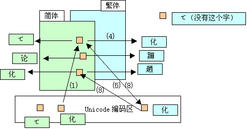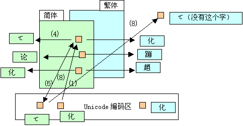 轉(zhuǎn)換:系統(tǒng)主動的轉(zhuǎn)換,比如從Unicode的“化”字到Big5的“化”字,內(nèi)碼變成Big5的。如果Big5沒有對應(yīng)的字,保留Unicode形式(&#xxxx;)