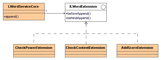 想要實現(xiàn)插件方式,可以建立接口!使用接口的好處是可以將定義和實現(xiàn)隔離,另外就是實現(xiàn)多態(tài)。我們建立一個留言擴展接口ILWordExtension,該接口有兩個函數(shù)beforeAppend和behindAppend。權(quán)限校驗、內(nèi)容檢查、加分這些功能可以看作是實現(xiàn)ILWordExtension接口的三個實現(xiàn)類,主業(yè)務邏輯就依次遍歷這三個實現(xiàn)類,來完成次業(yè)務邏輯。如圖1所示:
