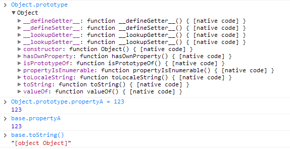 看上圖,Object.prototype已經(jīng)預(yù)定義好了一些屬性,我們再追加一條屬性叫propertyA,那么這個(gè)屬性和預(yù)定義屬性一樣,都可以從base上讀到。
