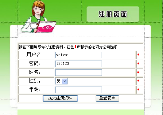 五、按F12預(yù)覽register.asp并輸入數(shù)據(jù),點(diǎn)擊提交按鈕