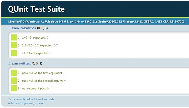 test("basic calculation", function() { equals(CalculateAPlusB(1,5),6,"1+5=6"); equals(CalculateAPlusB(1.2,5.5),6.7,"1.2+5.5=6.7"); equals(CalculateAPlusB(-1,10),9,"-1+10=9"); }); test("pass null test", function() { ok(isNaN(CalculateAPlusB(null,5)),"pass null as the first argument"); ok(isNaN(CalculateAPlusB(5,null)),"pass null as the second argument"); ok(isNaN(CalculateAPlusB(null,null)),"no argument pass in"); });