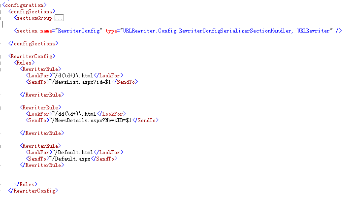 要注意的就是其中的<LookFor></LookFor>和<SendTO></SendTO>節(jié)點,寫到LookFor節(jié)點中的URL路徑是對外公布的URL路徑,而SendTO節(jié)點中的URL路徑則是IIS進行解析的時候返回的真實的路徑。上圖中節(jié)點一部分就是只要是類似字母d后面跟數(shù)字的都交給NewsListaspx帶參返回解析;而節(jié)點二部分就是只要是類似字母dd后面跟數(shù)字的都交給NewsDetails.aspx帶參返回處理;而節(jié)點三就是把html請求頁面轉(zhuǎn)為aspx請求返回。