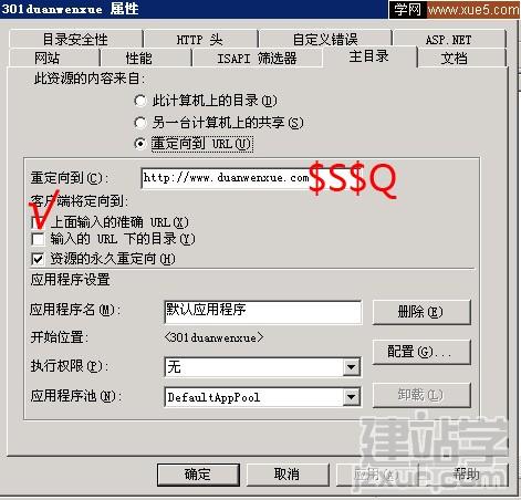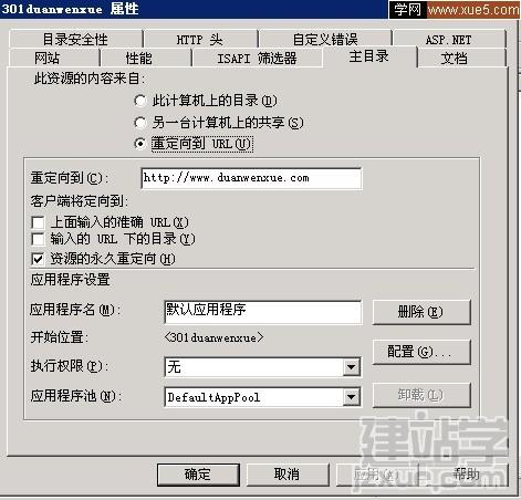 2.在IIS中選中剛才我們建立的站點(diǎn),右鍵,屬性,主目錄,選擇重定向到,輸入網(wǎng)址如:http://www.xxxx.com,同時注意選中下面的資源的永久重定向選項。如下圖: