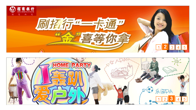 動畫效果介紹:這組廣告效果是打開頁面后圖片會自動播放,從1-5共計(jì)5張圖片,如果屬標(biāo)放到右下角的1、2、3、4、5列表上,可以自由進(jìn)行切換到自己想看的圖片上去。圖片切換是由下到上變換的。