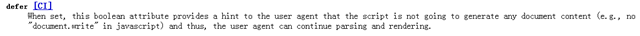 W3C標(biāo)準(zhǔn)HTML4.01給Script標(biāo)簽定義了一個(gè)defer屬性,指明該JS不會(huì)改變Dom的content,瀏覽器可繼續(xù)解析和渲染,無(wú)需阻塞在該Script。