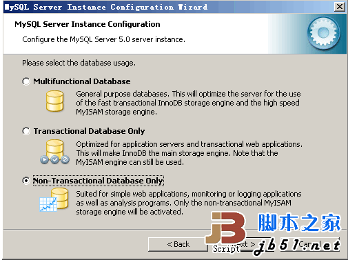選擇MySQL數(shù)據(jù)庫默認存儲方式:Non-Trans Only (MYISAM)