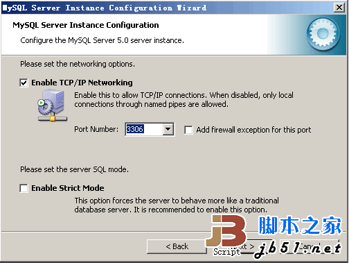 設(shè)定MySQL網(wǎng)絡(luò)參數(shù),注意:不要勾選啟用Strict Mode!那個Addfirewall的選項僅在需要外連MySQL的時候勾選上,也就是說給防火墻加個出入站的策略。