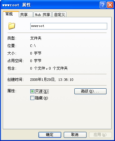 右鍵點(diǎn)擊wwwroot目錄,選擇“屬性”,可能會(huì)出現(xiàn)下圖所示情況,沒有“安全”標(biāo)簽。