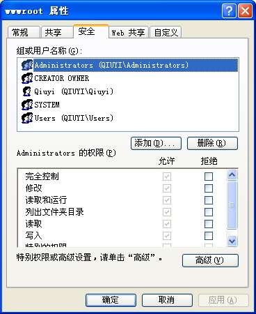 wwwroot目錄的屬性里有“安全”標(biāo)簽了,不過“組或用戶名稱”里沒有IIS的用戶。