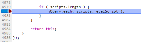 通過(guò)上面的分析,我們清楚的看到j(luò)Query.html函數(shù)會(huì)首先把其中的script檢索出來(lái),然后對(duì)于每個(gè)script標(biāo)簽應(yīng)用evalScript函數(shù)。