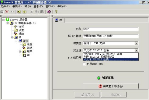 要啟用Serv-U服務(wù)器中域名為“SFTP”的SSL功能。在“Serv-U管理員”窗口中,依次展開“本地服務(wù)器→域→ RTJ”選項(xiàng),然后在右側(cè)的“域”管理框中找到“安全性”下拉列表選項(xiàng)。這里Serv-U提供了3種選項(xiàng),分別是“僅僅規(guī)則FTP,無SSL/TLS進(jìn)程”、“允許SSL/TLS和規(guī)則進(jìn)程”、“只允許SSL/TLS進(jìn)程”,默認(rèn)情況下,Serv-U使用的是“僅僅規(guī)則FTP,無SSL/TLS進(jìn)程”,因此是沒有啟用SSL加密功能的。在這里,筆者在“安全性”下拉選項(xiàng)框種選擇“只允許SSL/TLS進(jìn)程”選項(xiàng),然后點(diǎn)擊“應(yīng)用”按鈕,即可啟用SFTP域的SSL功能。