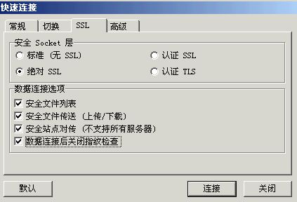 如果不選中“絕對SSL”,就無法成功連接到Serv-U服務(wù)器。最后點(diǎn)擊“連接”按鈕。