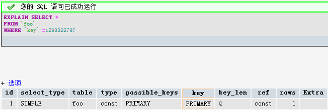 再后來,我將字段`key`換成INT類型,這時候,加不加單引號,就沒有什么差別了,EXPLAIN顯示他們都同樣能夠用上主索引,只是key_len變短了。