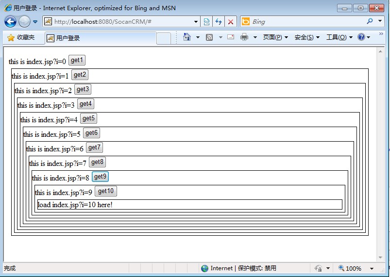 <div id="d<%= i %>" style="border:1px; border-style: solid; margin: 5px;">load index.jsp?i=<%= i+1 %> here!</div>