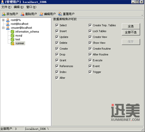 ,展開(kāi)就可以看到多個(gè)數(shù)據(jù)庫(kù)。點(diǎn)到剛才建立的數(shù)據(jù)庫(kù)xunmei再點(diǎn)擊右邊的“全選”,再點(diǎn)擊“保存”。這時(shí)xunmei數(shù)據(jù)庫(kù)上會(huì)有一個(gè)黃色鎖圖標(biāo),它表示xmuser用戶(hù)對(duì)xunmei數(shù)據(jù)庫(kù)有管理權(quán)限。如下圖: