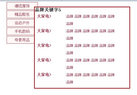 <span><a href="#">品牌</a></span><span><a href="#">品牌</a></span><span><a href="#">品牌</a></span><span><a href="#">品牌</a></span><span><a href="#">品牌</a></span><span><a href="#">品牌</a></span><span><a href="#">品牌</a></span>
