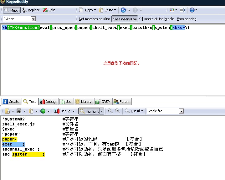 可疑的代碼肯定是由可以執(zhí)行危險操作的函數(shù)構(gòu)成,可以執(zhí)行危險操作的PHP函數(shù)最重要的就是“eval”函數(shù)了,對于加密的PHP代碼(僅變形字符串,非zend等方式加密),肯定要用到“eval”函數(shù),所以,對于不管是用哪種加密方法的代碼,肯定要用到“eval”函數(shù)。其次就是可以執(zhí)行系統(tǒng)命令的函數(shù)了,比如上面某牛的代碼中提到的四個“system”、“shell_exec”、“exec”、“popen”。當然還有其他的,比如passthru等。PHP還支持“·”字符(ESC鍵下面那個)直接執(zhí)行系統(tǒng)命令。我們可以把正則寫成這樣【\b(?P<function>eval|proc_open|popen|shell_exec|exec|passthru|system)\b\s*\(】。