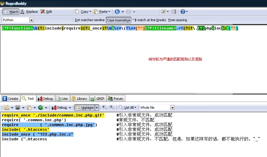 再看下面的【\s*\(?\s*["'](?P<filename>.+?(?<!\.(?:php|inc)))["']】中,【\s*】匹配空白字符,包括空格,tab鍵等。后面的【\(?】,匹配字符“(”,后面的量詞“?”表示這半個小酷括號可有可無。防止“incude “123.php””這種沒有括號的情況。再后面【["']】匹配雙引號,單引號的。最后的也是。再看看這個【(?P<filename>.+?(?<!\.(?:php|inc)))】,其中【(?P<filename>)】上面介紹了,為命名捕獲,把結(jié)果放到match.group(“filename”)里?!?*?】為任意字符,后面的量詞是“忽略優(yōu)先量詞”,也就是平常說的“非貪婪”。這里最少匹配零個,(防止.aa、.htaccess這種沒有文件名,只有文件拓展名的文件被引入)。后面的【(?<!\.(?:php|inc))】,這里用到了反向零寬斷言(環(huán)視)的非操作(只匹配位置,不匹配字符串,跟【^$\b】等一樣)。這個表達式是針對這個位置的后面字符起作用的,也就是說后面的【["']】的前面不能是“.php”、“.inc”,這里也就是取了文件名的最后的拓展名。(正則里,可以用【^】對字符取非,但是不能對“字符串組”取非,這里用了零寬斷言來實現(xiàn)。)