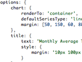 Setting the Highcharts configuration options requires no special programming skills. The options are given in a JavaScript object notation structure, which is basically a set of keys and values connected by colons, separated by commas and grouped by curly brackets.