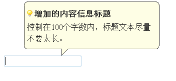 <asp:TextBox ID="TextBox1" runat="server" HintTitle="增加的內(nèi)容信息標(biāo)題" HintInfo="控制在100個字?jǐn)?shù)內(nèi),標(biāo)題文本盡量不要太長。"></asp:TextBox></div>