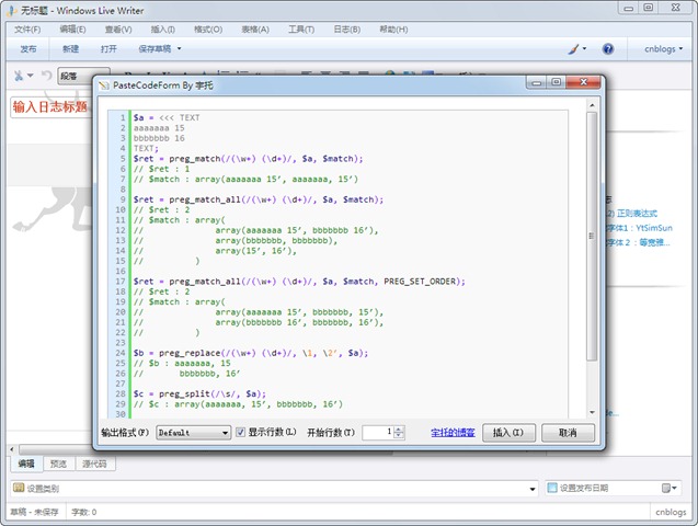 本插件支持從Visual Studio,Eclipse上直接復(fù)制代碼,也可以從HippoEDIT上直接復(fù)制代碼。當(dāng)然Notepad++也有NppExport插件,可以把代碼以RTF格式復(fù)制,復(fù)制好后,點(diǎn)擊本插件的鏈接“Poste Code”,即可看到生成的代碼預(yù)覽,然后點(diǎn)插入即可把代碼插入Live Write。