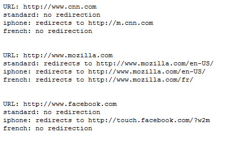 在第一個(gè)例子中,我們將提供一段用于偵測服務(wù)器是否有基于瀏覽器的重定向的代碼。例如,有些網(wǎng)站會(huì)根據(jù)是否是手機(jī)瀏覽器甚至用戶來自哪個(gè)國家來重定向網(wǎng)頁。