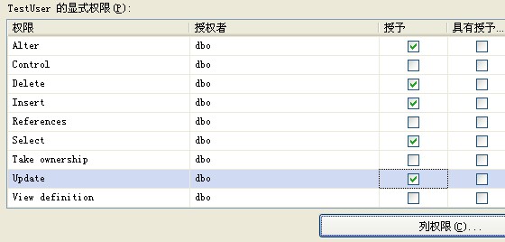 6. 在上面點(diǎn)擊【確認(rèn)】后,我們就可以下面的列表中找到對應(yīng)的權(quán)限,如果你還想細(xì)化到列的權(quán)限的話,右下角還有一個(gè)【列權(quán)限】的按鈕可以進(jìn)行設(shè)置,點(diǎn)擊【確認(rèn)】按鈕就完成了這些權(quán)限的設(shè)置了