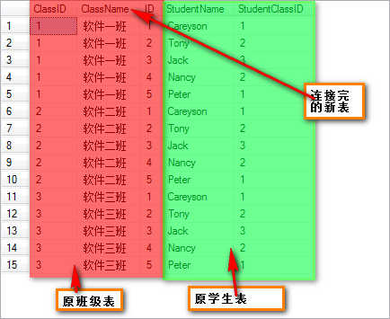 然后通過on后面的限制條件,只選擇那些StudentClassID和ClassID相等的列(上圖中劃了綠色的部分),最終,得到選擇后的表的子集