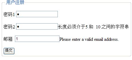 在上一個(gè)示例的基礎(chǔ)上添加了一個(gè)messages項(xiàng),為其指定了一個(gè)對象類型的值,與rules基本對應(yīng),特意沒有指定email的錯(cuò)誤信息,運(yùn)行結(jié)果如下: