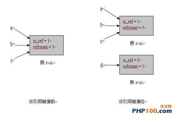 這段代碼的前三句將把a、b和c指向一個zval,其is_ref=1, refcount=3;第四句是個非引用賦值,通常情況下只需要增加引用計數(shù)即可,然而目標(biāo)zval屬于引用變量,單純的增加引用計數(shù)顯然是錯誤的, Zend的解決辦法是為d單獨生成一份zval副本。