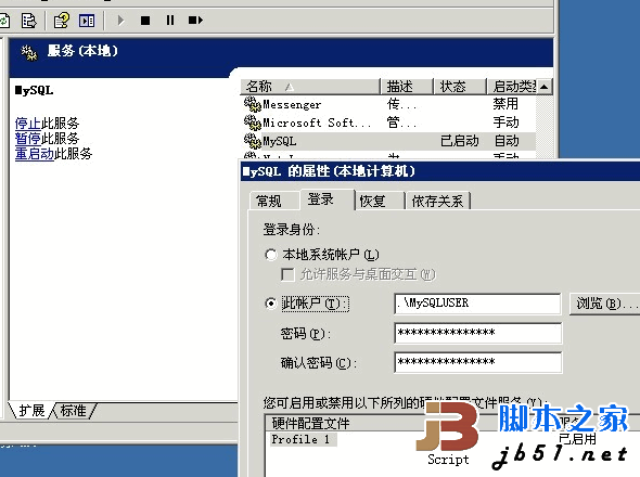 又研究了半天,最后終于搞定,發(fā)現(xiàn)他原來的計(jì)算機(jī)管理員用戶名里有個$字符,心想不會是他的事兒吧,就建了一個正常的獨(dú)立計(jì)算機(jī)賬戶MySQLUSER,然后在進(jìn)程里把mysqld.exe結(jié)束,然后在MySQL所在的目錄上點(diǎn)右鍵屬性安全,添加MySQLUSER這個用戶并給完全控制權(quán)限,再打開服務(wù)管理器在MySQL服務(wù)上點(diǎn)右鍵,輸入剛才建立的賬號和密碼確定,如下圖!