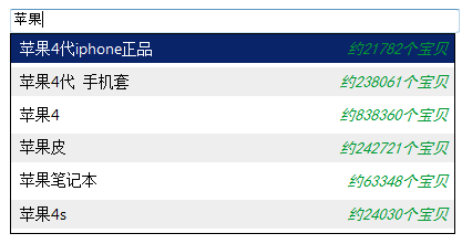 return "<table width='400px'><tr><td align='left'>" + row.Key + "</td><td align='right'><font style='color: #009933; font-family: 黑體; font-style: italic'>約" + row.Value + "個(gè)寶貝</font> </td></tr></table>";