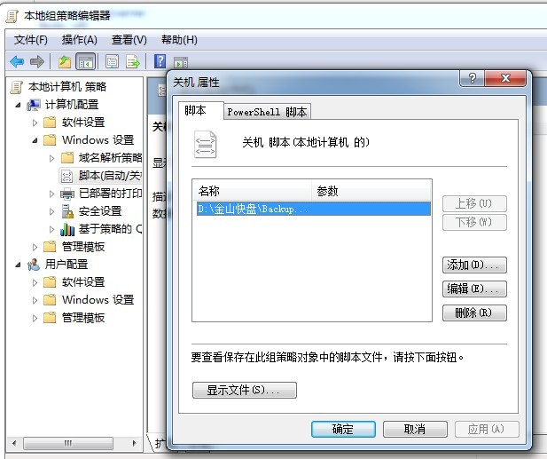 1:開始 -- 運(yùn)行 -- 輸入gpedit.msc 然后出來了組策略.計(jì)算機(jī)配置---windows設(shè)置---腳本(啟動(dòng)和關(guān)機(jī)) 雙擊關(guān)機(jī)策略,再點(diǎn)添加--瀏覽到你的批處理文件.