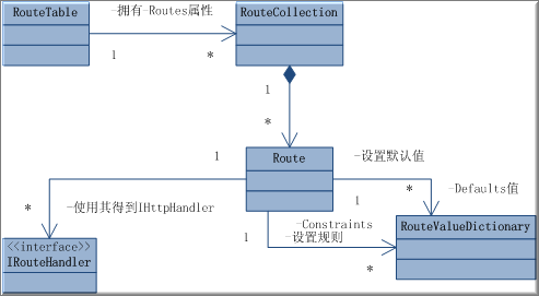 為了方便大家理解我繪制了一個UML圖,其中通過RouteTable的Routes這個屬性可以獲取一個RouteCollection的Singleton模式,雖然在其中并沒有判斷值不存在時才初始化的Singleton的標(biāo)志性行為,但是它是在Application_Start事件中進(jìn)行初始化的,并且直到應(yīng)用程序進(jìn)程終結(jié),所以是Singleton模式的。