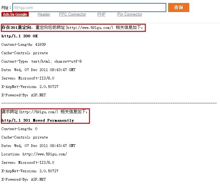 即可實現(xiàn)301重定向。完成后,我們可以訪問jb51.net 發(fā)現(xiàn)在瀏覽器欄內(nèi)已經(jīng)自動變?yōu)?www.dhdzp.com 。為了確認(rèn)301重定向成功,我開發(fā)了個檢測網(wǎng)頁HTTP返回狀態(tài)值的工具,可以用于檢測某網(wǎng)址是否做了301重定向,網(wǎng)址是:http://www.dhdzp.com/http_header/ 。下圖是,我用該工具對做完301重定向后的檢測。