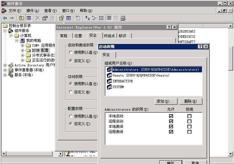 4、安全標(biāo)簽中“啟動(dòng)和激活權(quán)限”選擇自定義,編輯,添加網(wǎng)站使用的IIS帳號(hào)或添加 Guests組 確定即可(如下圖)。