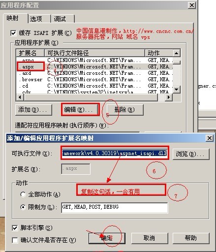 3.如右側(cè)窗口,找到 .aspx 擴(kuò)展名——》編輯——》復(fù)制 可執(zhí)行文件的路徑——》關(guān)閉