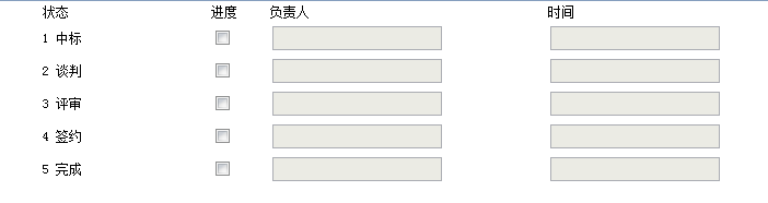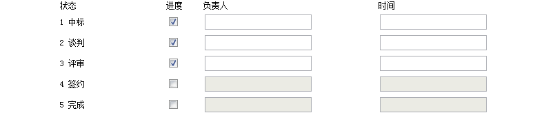 狀態(tài)共有5中,要求點(diǎn)擊某個(gè)狀態(tài)的復(fù)選框時(shí),這個(gè)狀態(tài)和它之前的狀態(tài)的文本框都可以編輯,之后的文本框都不可以編輯,如圖示