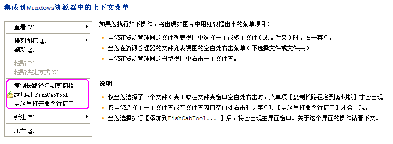 3. FishCabToolExt.dll,它是一個(gè)Windows資源管理器的插件,可以讓我的工具也能像一些壓縮軟件一樣,直接在Windows資源管理器的右鍵菜單中操作,如下圖: